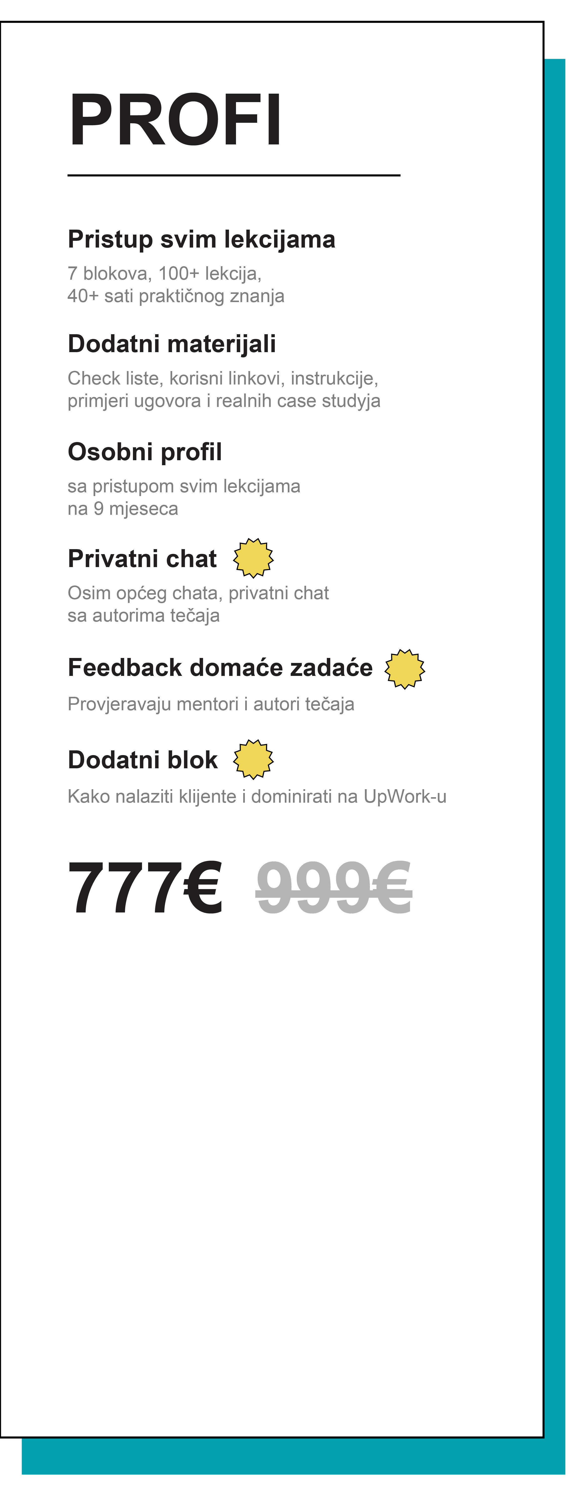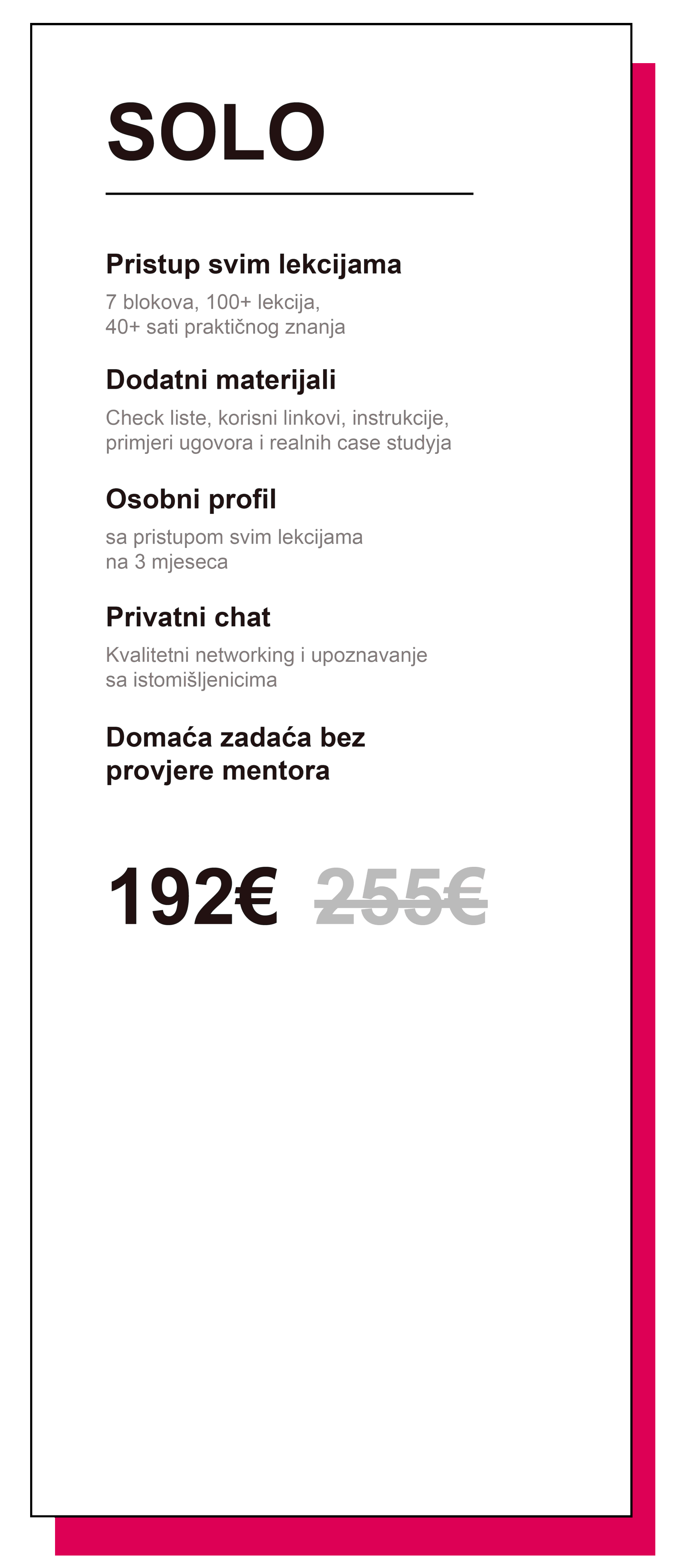 pronalazite svog prvog klijenta, analizirate i oblikujete profile, savladavate prodajne alate putem osobnog i komercijalnog Instabloga, učite kako angažirati i zadržati publiku, sastavljate content planove.